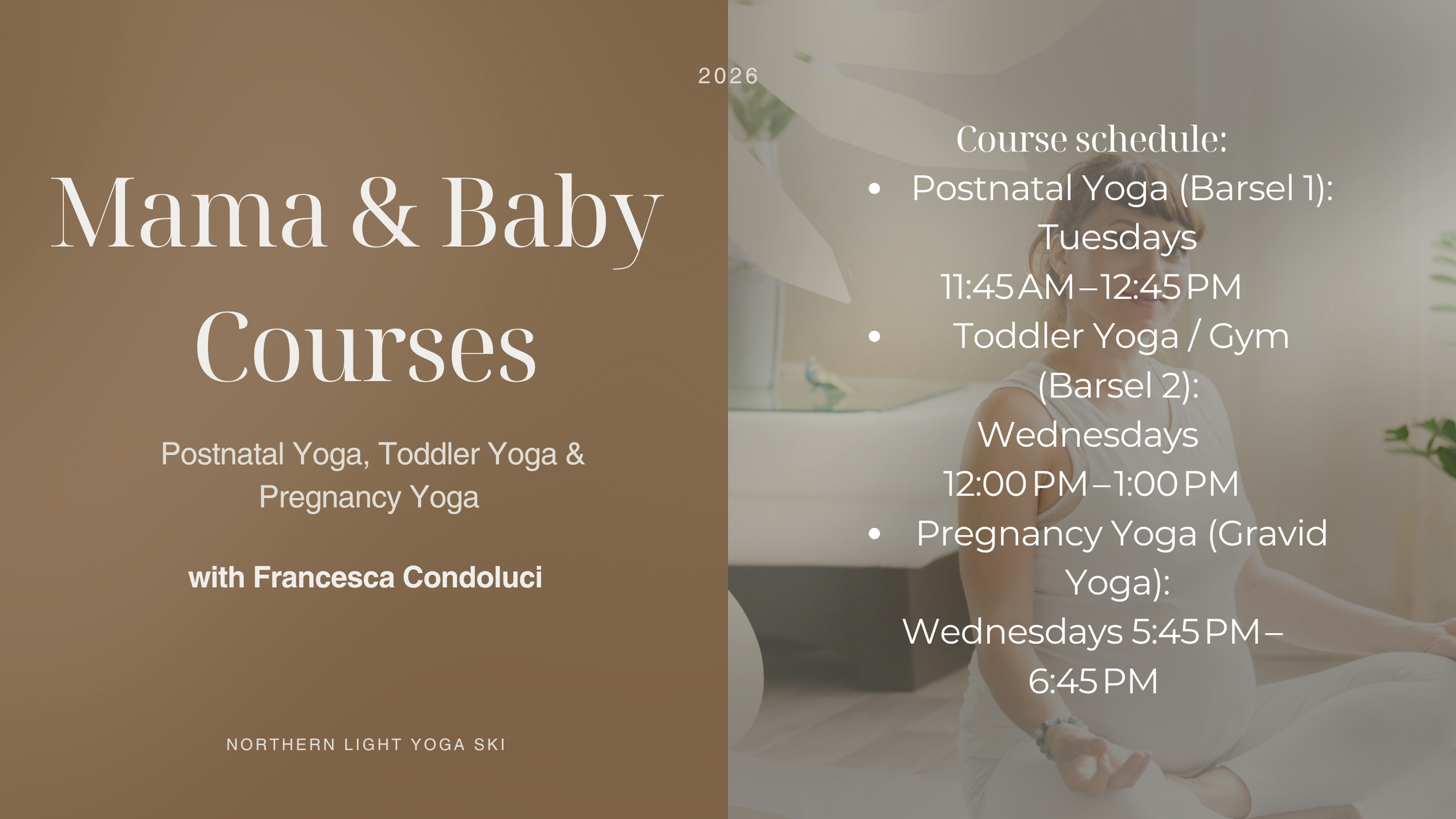 She specializes in Hatha, Ashtanga, and yoga for mothers, children and families. Her teaching combines mindful movement, breathwork, and meditation to support strength, flexibility, and emotional balance.